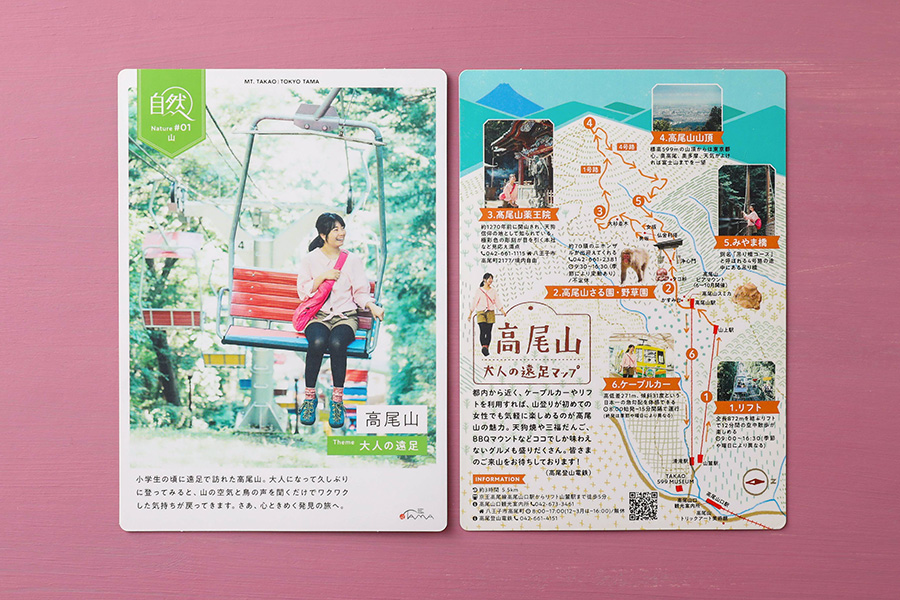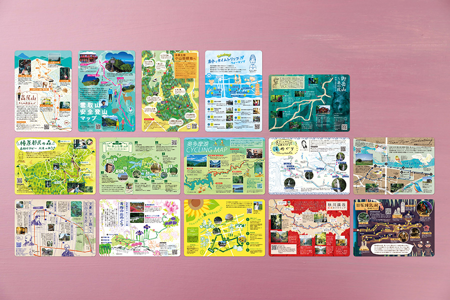 東京多摩を楽しむ図鑑カード、2019年は自然編。前年の総合編から視点を下ろし、多摩の豊かな自然を歩いたり、サイクリングしたりしながら楽しめる15のコースを提案しています。登山ビギナーでも楽しみ方いろいろな高尾山、狼信仰が今も息づく御岳山、2000m級の雲取山…「山」カテゴリーひとつ取っても、どの切り口で紹介しようか迷うほど多様な顔を持っています。