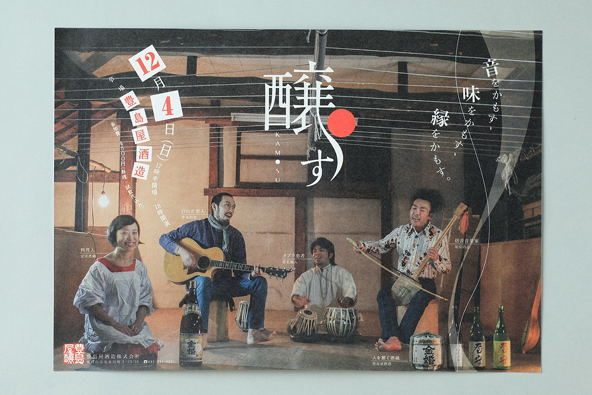 まちジャムの大善院ステージのトリを務めてくれたKAMOSUのライブと、旅する料理人・安田花織さんが作る発酵料理。それらが豊島屋酒造の酒蔵で楽しめるという”発酵づくし”のイベントリーフレットを制作しました。この日をきっかけに本格的に結成されたKAMOSUは、その後日本全国や台湾でもライブ活動を展開し、醸しの輪を広げています。